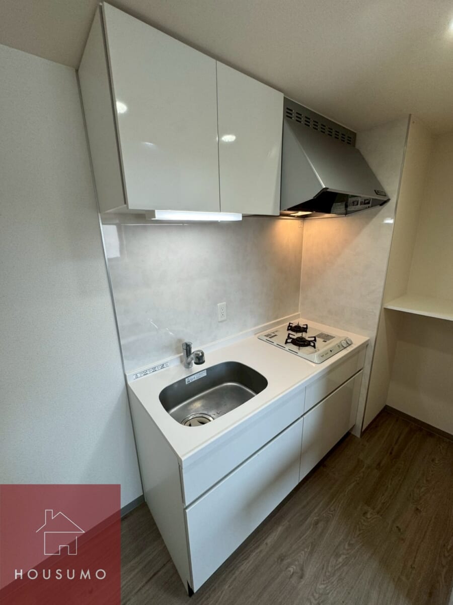 キッチンはコンパクトながら使い勝手を重視した設計で、2口ガスコンロを完備。調理スペースも確保されており、自炊派の方にも嬉しい環境です。上下に収納スペースがあり、食器や調理器具を整理しやすく、作業効率が上がります。キッチン周りはお掃除も簡単で、常に清潔な状態を保てます。