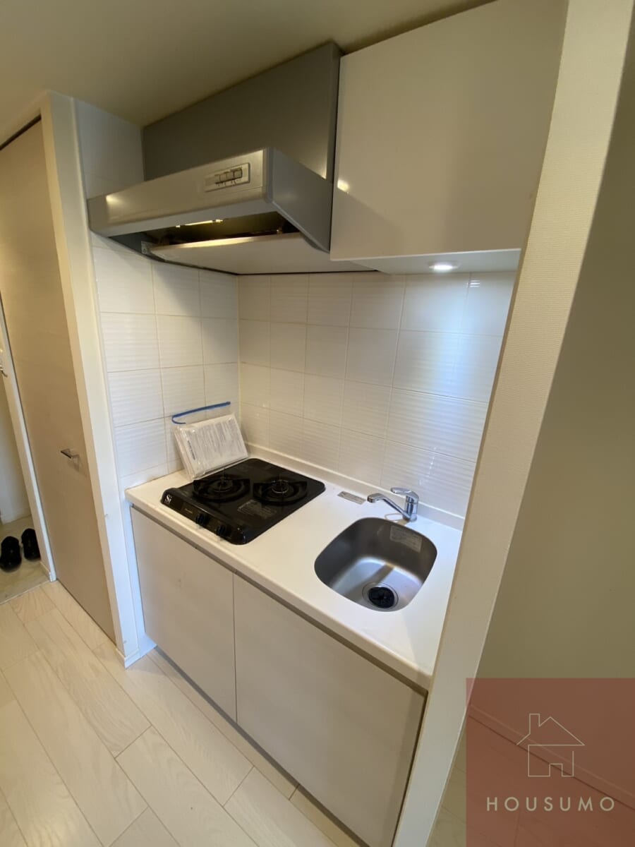 1Kタイプでも無理なく使えるコンパクトキッチンは、2口IHコンロ付きで料理の幅も広がります。上部収納は最小限ですが、キッチン周りに棚やラックを置けるスペースが確保されており、食器や調味料を効率的に整理可能です。白を基調とした清潔感あるデザインで、毎日の料理が楽しくなる空間です。忙しい転勤者の方でも、シンプルな動線でスムーズに料理ができる工夫が施されています。