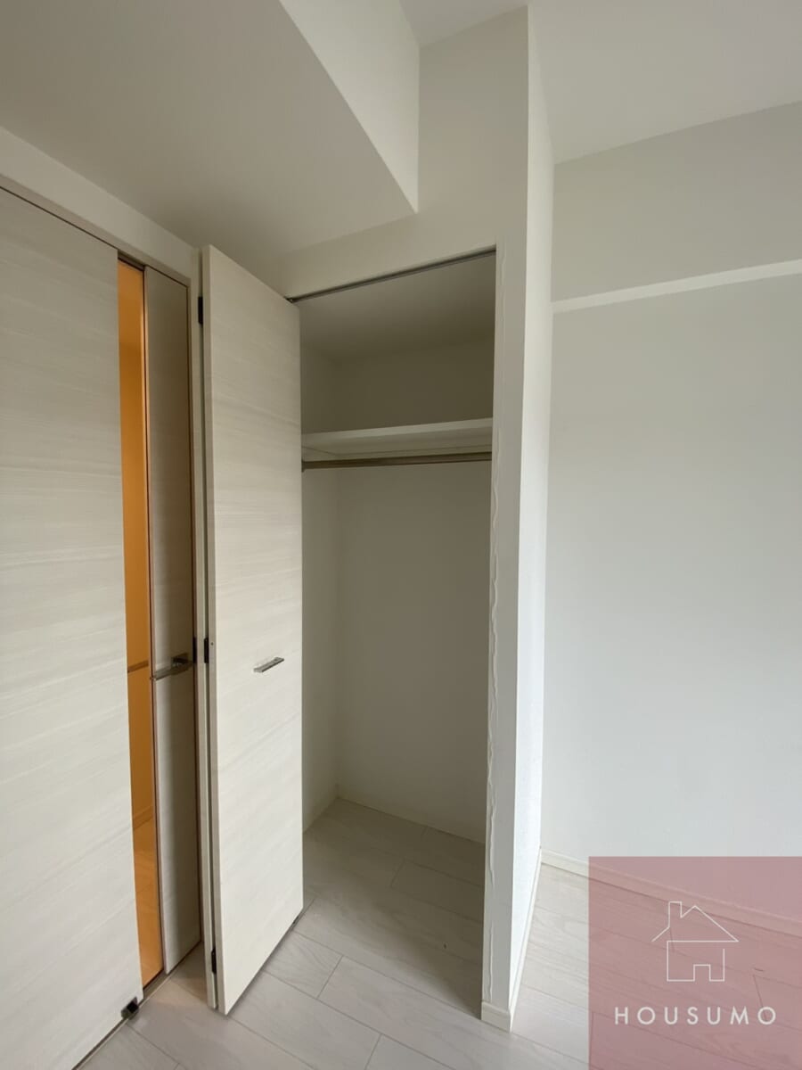 クローゼットはコンパクトですが、ハンガーラッグ付きで、シャツ類はしわなくかけることができます。入りきらないオフシーズンの衣類はボックス収納やベッド下収納などで補うのがおすすめ。限られたスペースを有効活用することで、スッキリとした暮らしが実現します。