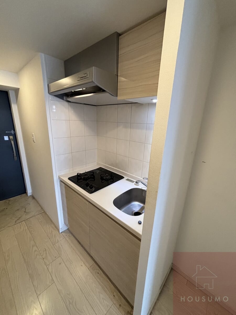 1Kタイプでも無理なく使えるコンパクトキッチンは、2口IHコンロ付きで料理の幅も広がります。上部収納は最小限ですが、キッチン周りに棚やラックを置けるスペースが確保されており、食器や調味料を効率的に整理可能です。白を基調とした清潔感あるデザインで、毎日の料理が楽しくなる空間です。忙しい転勤者の方でも、シンプルな動線でスムーズに料理ができる工夫が施されています。