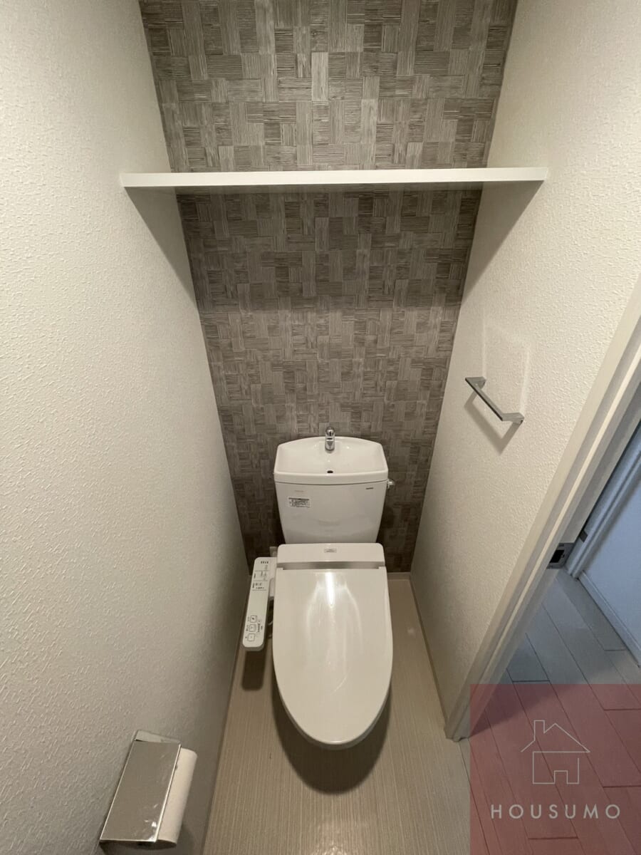 独立タイプのトイレは、温水洗浄便座付きで機能性も高く、清潔感のある快適な空間に仕上がっています。シンプルでありながらも生活に欠かせない設備がしっかり整っており、来客時にも安心です。グレーのアクセントウォールが落ち着いた雰囲気で日常のちょっとした時間も快適に過ごせます。