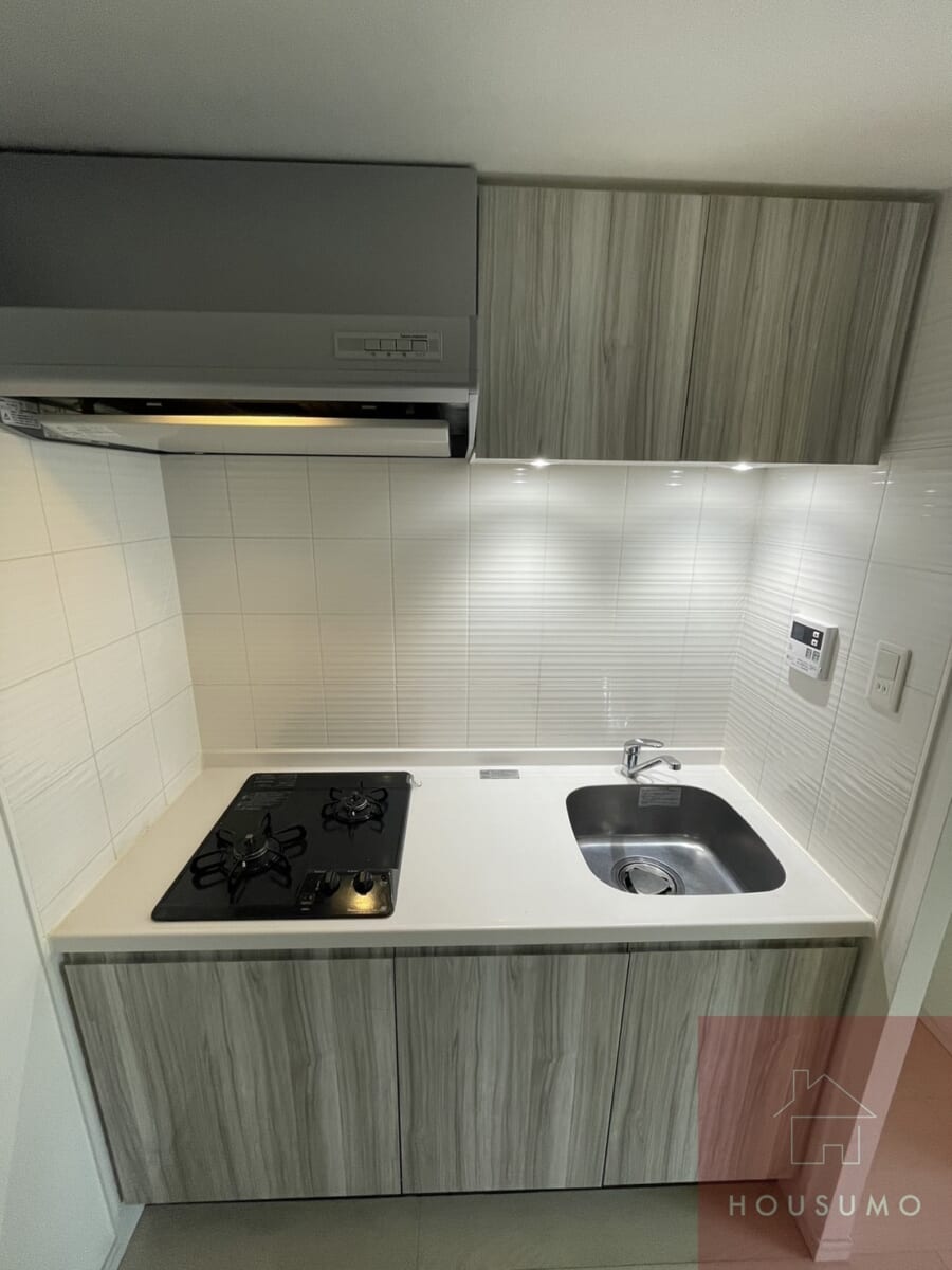 キッチンはコンパクトながら使い勝手を重視した設計で、2口ガスコンロを完備。調理スペースも確保されており、自炊派の方にも嬉しい環境です。上下に収納スペースがあり、食器や調理器具を整理しやすく、作業効率が上がります。キッチン周りはお掃除も簡単で、常に清潔な状態を保てます。