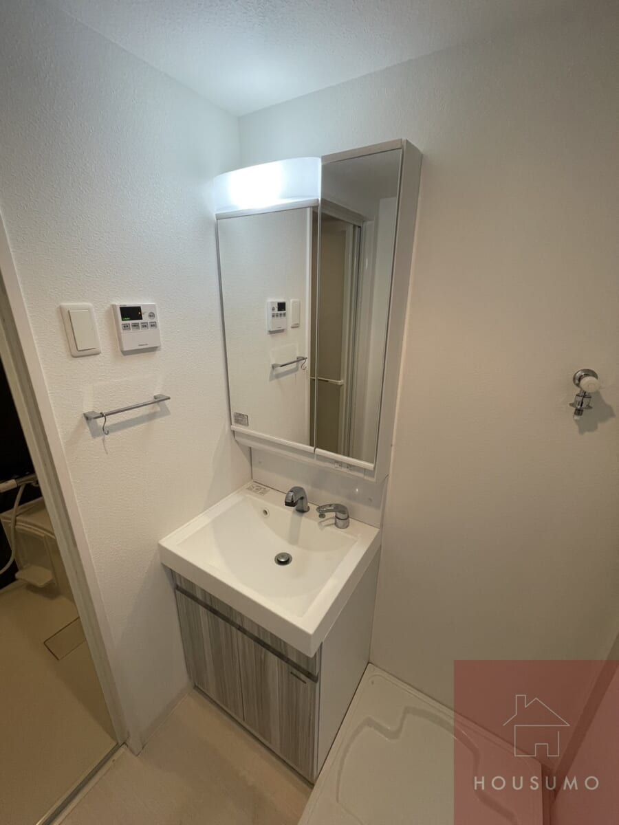 脱衣室には独立洗面台と洗濯機置き場を完備。独立洗面台は、キッチンと同じカラーで設計されており、空間全体に統一感があるのが特長です。デザイン性の高さだけでなく、使い勝手にも配慮されており、朝の準備や帰宅後も快適。洗濯機置き場もゆったりと確保されており、ストレスなく日常家事がこなせます。