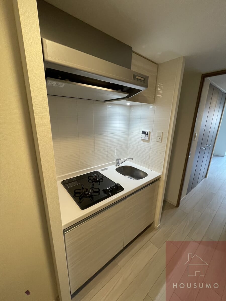 キッチンはコンパクトながら使い勝手を重視した設計で、2口ガスコンロを完備。調理スペースも確保されており、自炊派の方にも嬉しい環境です。上下に収納スペースがあり、食器や調理器具を整理しやすく、作業効率が上がります。キッチン周りはお掃除も簡単で、常に清潔な状態を保てます。