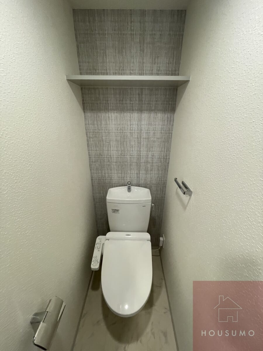 独立タイプのトイレは、温水洗浄便座付きで機能性も高く、清潔感のある快適な空間に仕上がっています。シンプルでありながらも生活に欠かせない設備がしっかり整っており、来客時にも安心です。グレーのアクセントウォールが落ち着いた雰囲気で日常のちょっとした時間も快適に過ごせます。