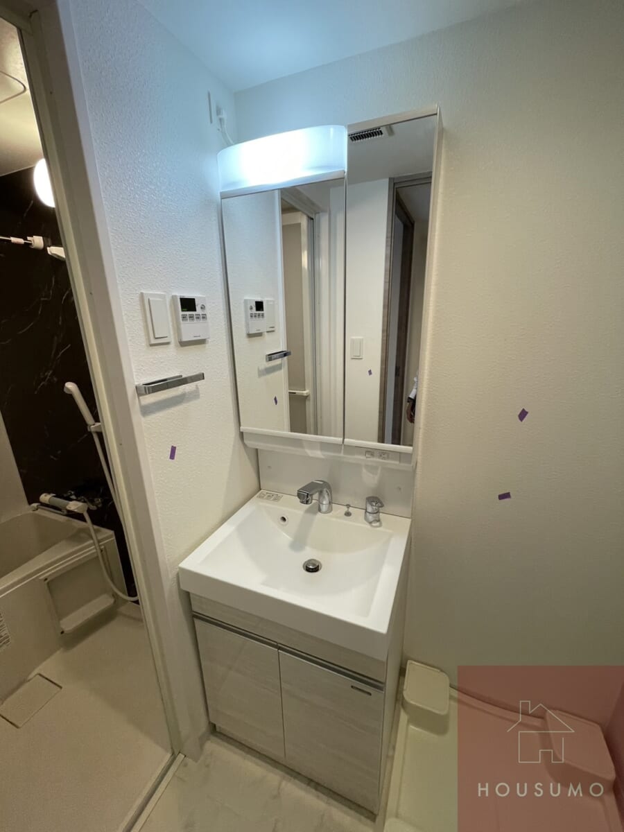 脱衣室には独立洗面台と洗濯機置き場が完備されているので、朝の身支度や帰宅後の手洗い、夜のスキンケアタイムまで、使い勝手がよくストレスのない設計です。鏡裏収納付きですっきりとした清潔感ある見た目に◎脱衣室がしっかりと区切られているので、来客時のプライバシーもしっかりと確保できます。