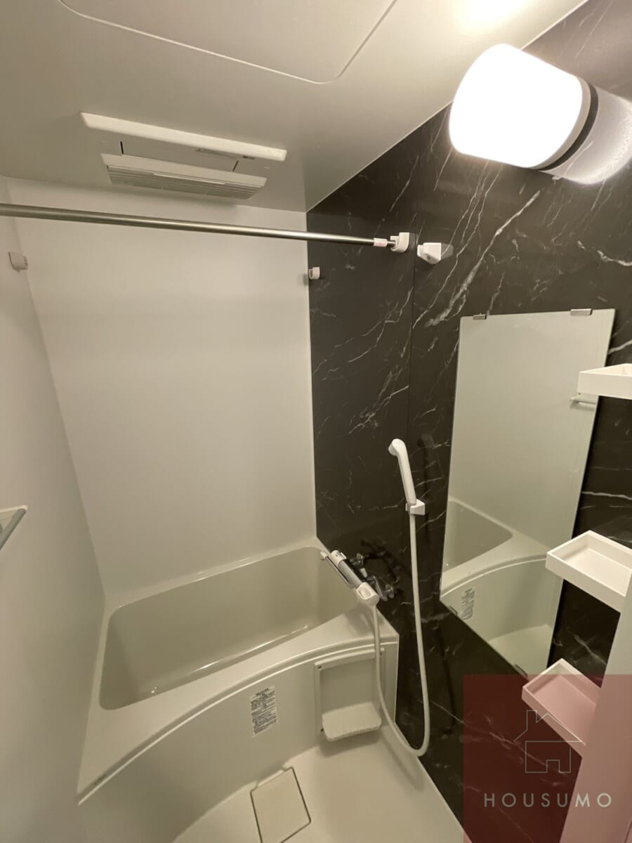 バスルームは浴室乾燥機能つきなので、天気に左右されずに洗濯物が乾かすことができ、