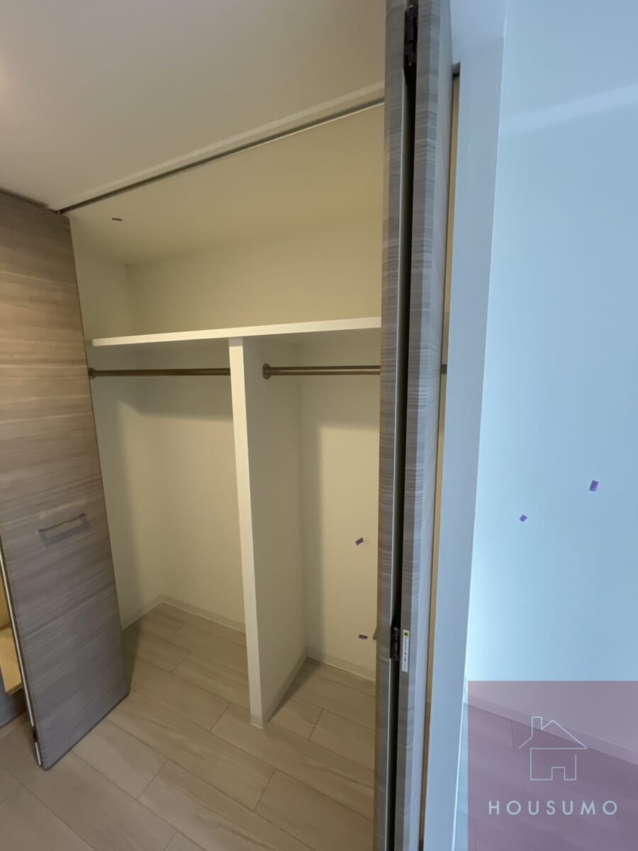 洋室の収納は奥行きこそあまりありませんが、横幅があるため衣類や小物の整理に便利です。扉を開けると中は二つに仕切られており、用途に応じてスペースを分けて使える設計です。季節ごとの衣類やバッグ、日用品などを効率よく整理でき、一人暮らしの限られた空間でもスッキリとした生活をサポートします。