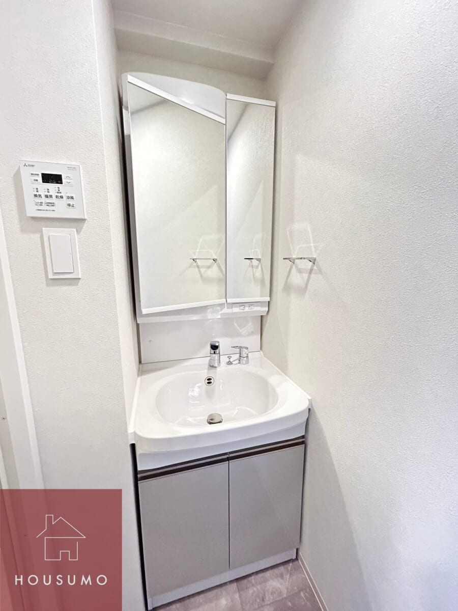 脱衣室には独立洗面台を完備されているので、朝の身支度や帰宅後の手洗い、夜のスキンケアタイムまで、使い勝手がよくストレスのない設計です。鏡裏収納付きですっきりとした清潔感ある見た目に◎脱衣室がしっかりと区切られているので、来客時のプライバシーもしっかりと確保できます。