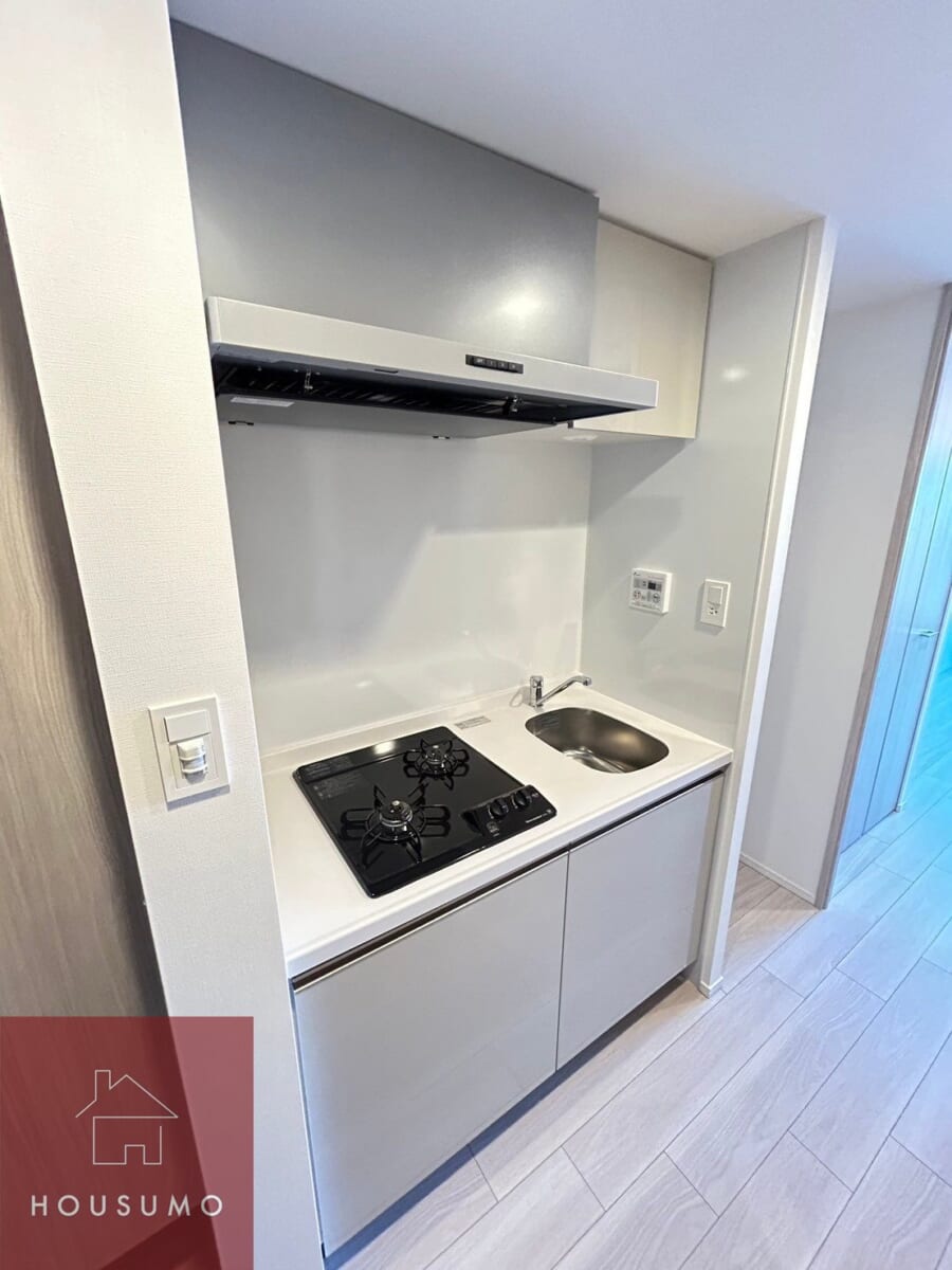 キッチンはコンパクトながら使い勝手を重視した設計で、2口ガスコンロを完備。調理スペースも確保されており、自炊派の方にも嬉しい環境です。上下に収納スペースがあり、食器や調理器具を整理しやすく、作業効率が上がります。キッチン周りはお掃除も簡単で、常に清潔な状態を保てます。