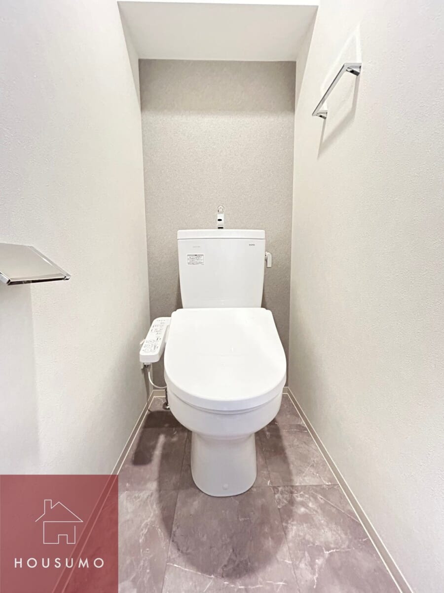 独立タイプのトイレは、温水洗浄便座付きで機能性も高く、清潔感のある快適な空間に仕上がっています。シンプルでありながらも生活に欠かせない設備がしっかり整っており、来客時にも安心です。グレーのアクセントウォールが落ち着いた雰囲気で日常のちょっとした時間も快適に過ごせます。