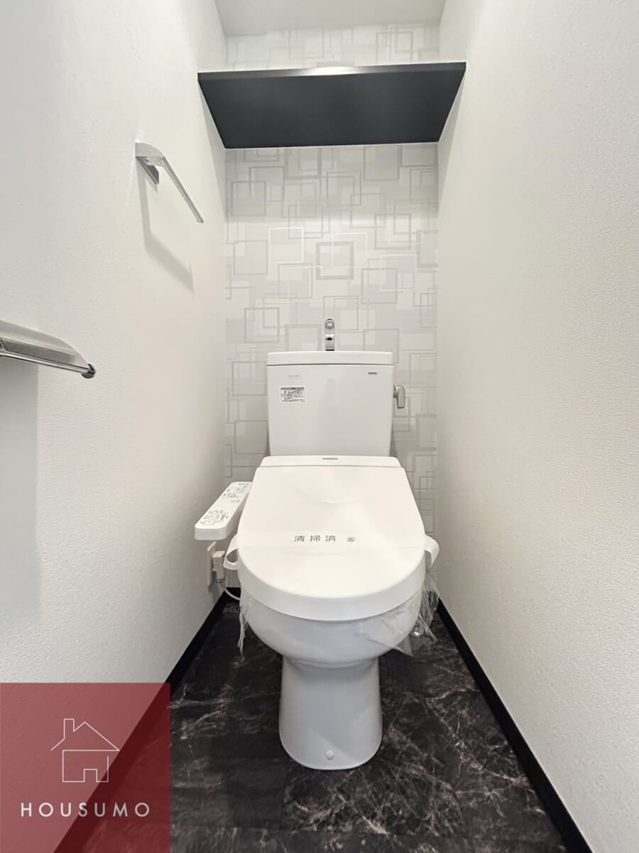 トイレは、温水洗浄便座付きで機能性も高く、清潔感のある快適な空間に仕上がっています。シンプルでありながらも生活に欠かせない設備がしっかり整っており、来客時にも安心です。頭上にある収納棚は、トイレットペーパーや掃除用品、ストック類などをすっきりと隠せるため、生活感を出さずに美しく保てます。