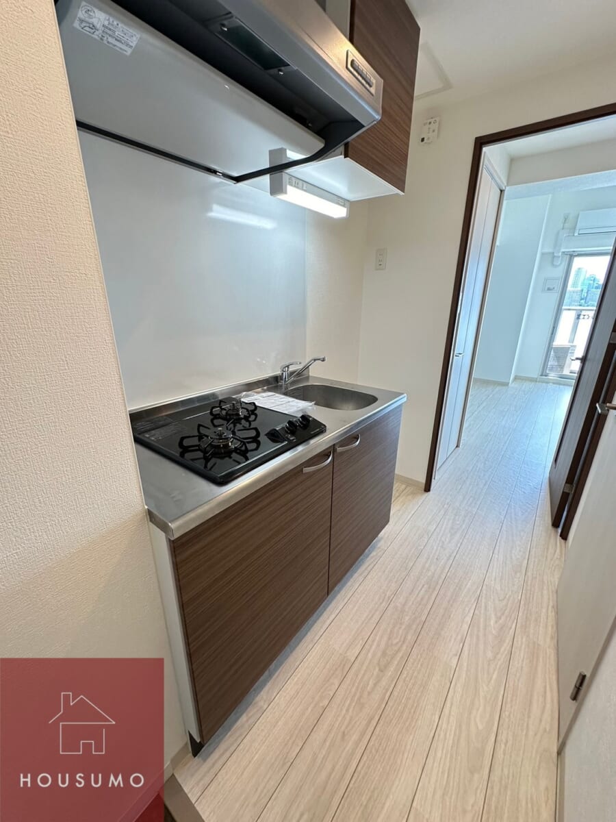 1Kタイプでも無理なく使えるコンパクトキッチンは、2口ガスコンロ付きで料理の幅も広がります。上部収納は最小限ですが、キッチン周りに棚やラックを置けるスペースが確保されており、食器や調味料を効率的に整理可能です。白を基調とした清潔感あるデザインで、毎日の料理が楽しくなる空間です。忙しい転勤者の方でも、シンプルな動線でスムーズに料理ができる工夫が施されています◎