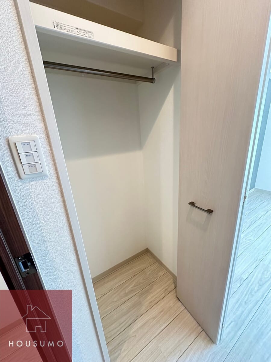 クローゼットはコンパクトですが、ハンガーラッグ付きで、シャツ類はしわなくかけることができます。入りきらないオフシーズンの衣類はボックス収納やベッド下収納などで補うのがおすすめ。限られたスペースを有効活用することで、スッキリとした暮らしが実現します◎