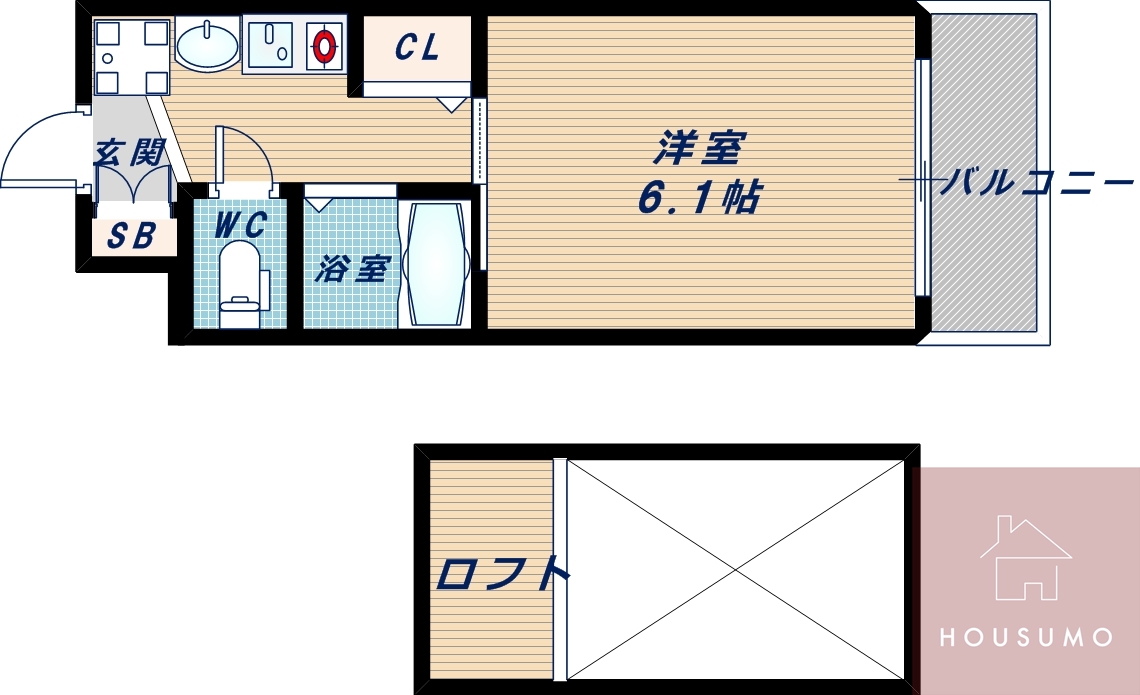 6.1畳の洋室は、南東向きならではの柔らかな朝日が差し込み、一日を心地よくスタートできる明るい空間です。天井高がしっかりあり、視線が抜けるため面積以上の広さを感じられます。ベッドスペースが独立して確保されているため、生活ゾーンと休息ゾーンを自然に分けることができ、ワンルームでも生活にリズムが生まれます。家具の配置がしやすい形状で、ワークデスクやラックを置きたい一人暮らしの方にもフィットします。1.4畳の使いやすいロフトは、収納専用としても、ゆったりベッドスペースとしても活用できる万能エリアです◎