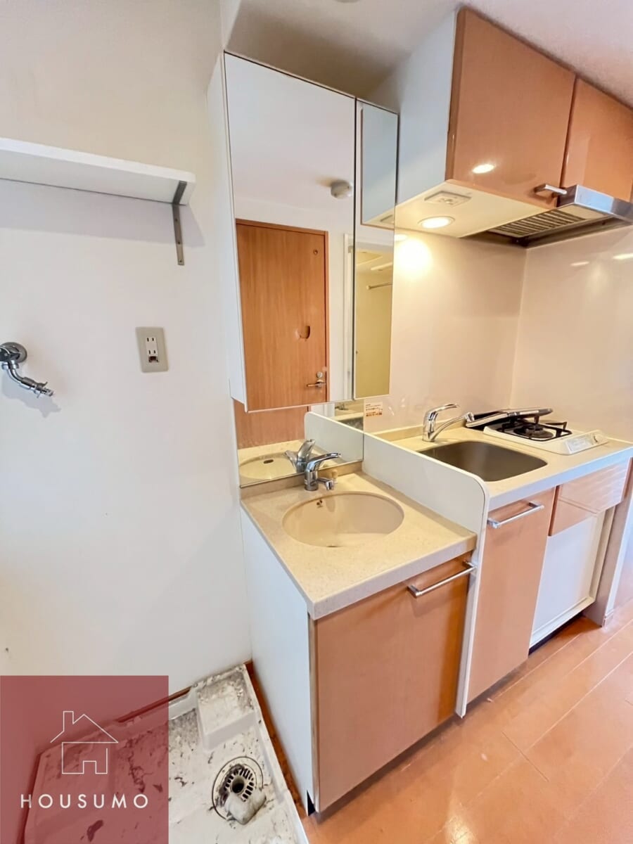 脱衣室はありませんが、キッチン横に独立洗面台と洗濯機置き場が並ぶ設計になっています。生活動線がコンパクトにまとまっており、洗顔や身支度、洗濯作業をスムーズにこなせるのが魅力です。独立洗面台は朝の身支度にも使いやすく、収納棚が少なくても小物の整理がしやすい設計です。限られたスペースながら、日常生活の利便性をしっかり確保した工夫が感じられるます◎