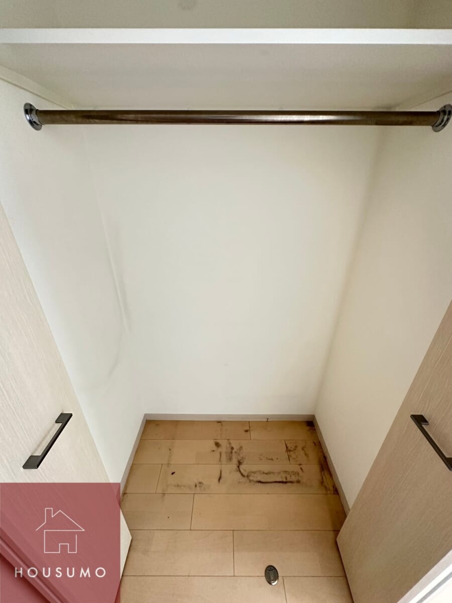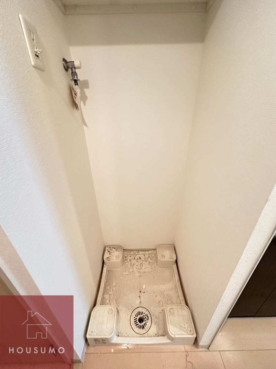 キッチン横には洗濯機置き場が設置されており、家事動線が非常にスムーズです。調理中や洗濯中の移動距離が短く、効率的に日常の作業をこなせる点が魅力です。扉や仕切りがなく開放的な設計になっているため、圧迫感が少なく、使い勝手も良好です。上部には棚が備え付けられており、洗剤や掃除用品、キッチン用品などを収納するのに便利。単身生活の限られたスペースでも整理整頓がしやすく、快適な暮らしをサポートする設備です◎