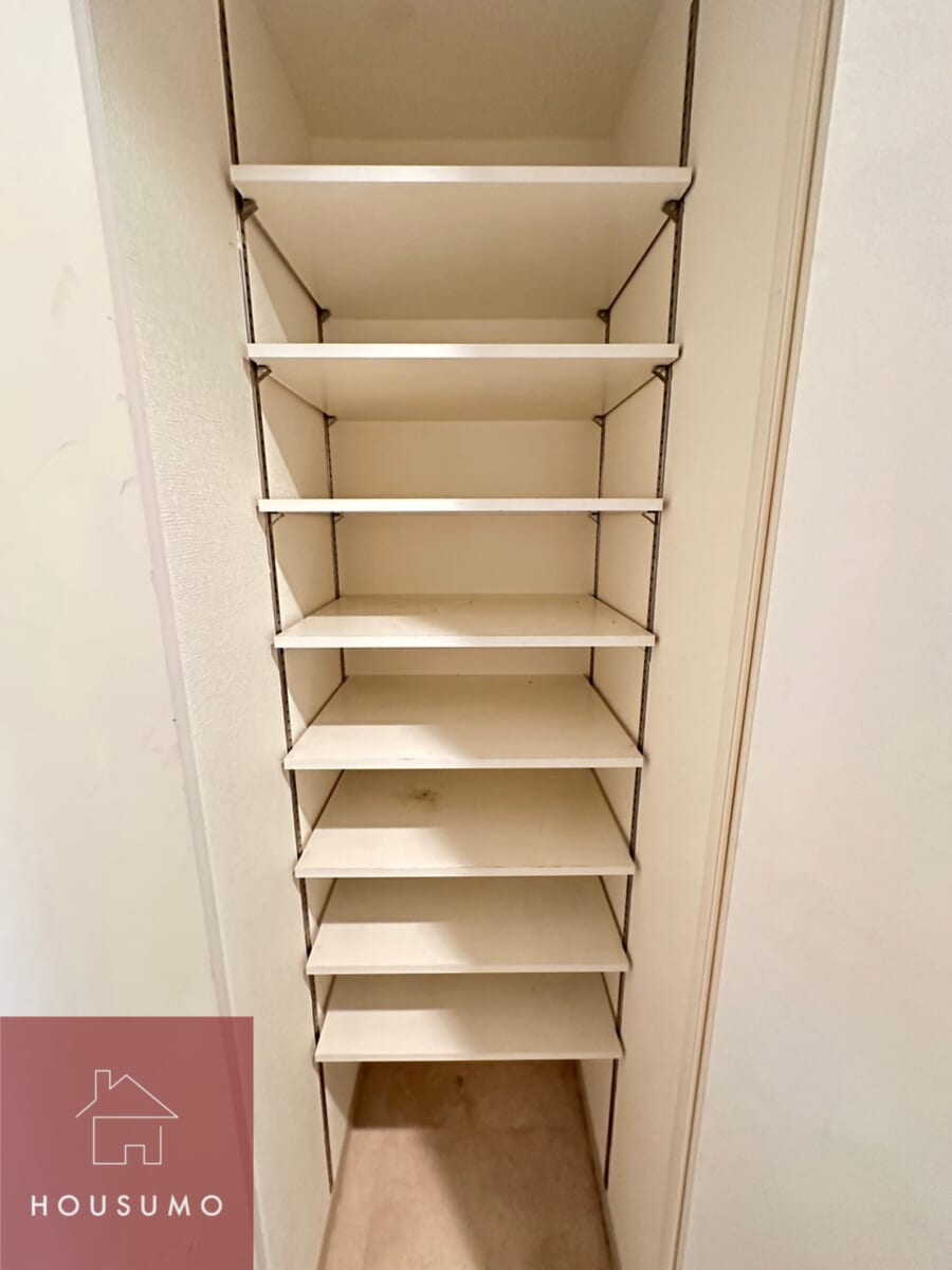 洋室にはコンパクトながら使い勝手の良いクローゼットが備わっており、衣類や小物を整理しながらすっきりと収納できます。また、玄関には靴箱に加えて、棚付きの収納スペースが設けられており、日用品のストックや掃除用具、アウトドア用品なども効率的に収納可能です。限られたスペースでも整理整頓がしやすく、生活動線を妨げずに使える点が魅力で、単身の方や在宅ワークの方でも、身の回りをすっきり保ちながら快適に暮らせる設計です◎