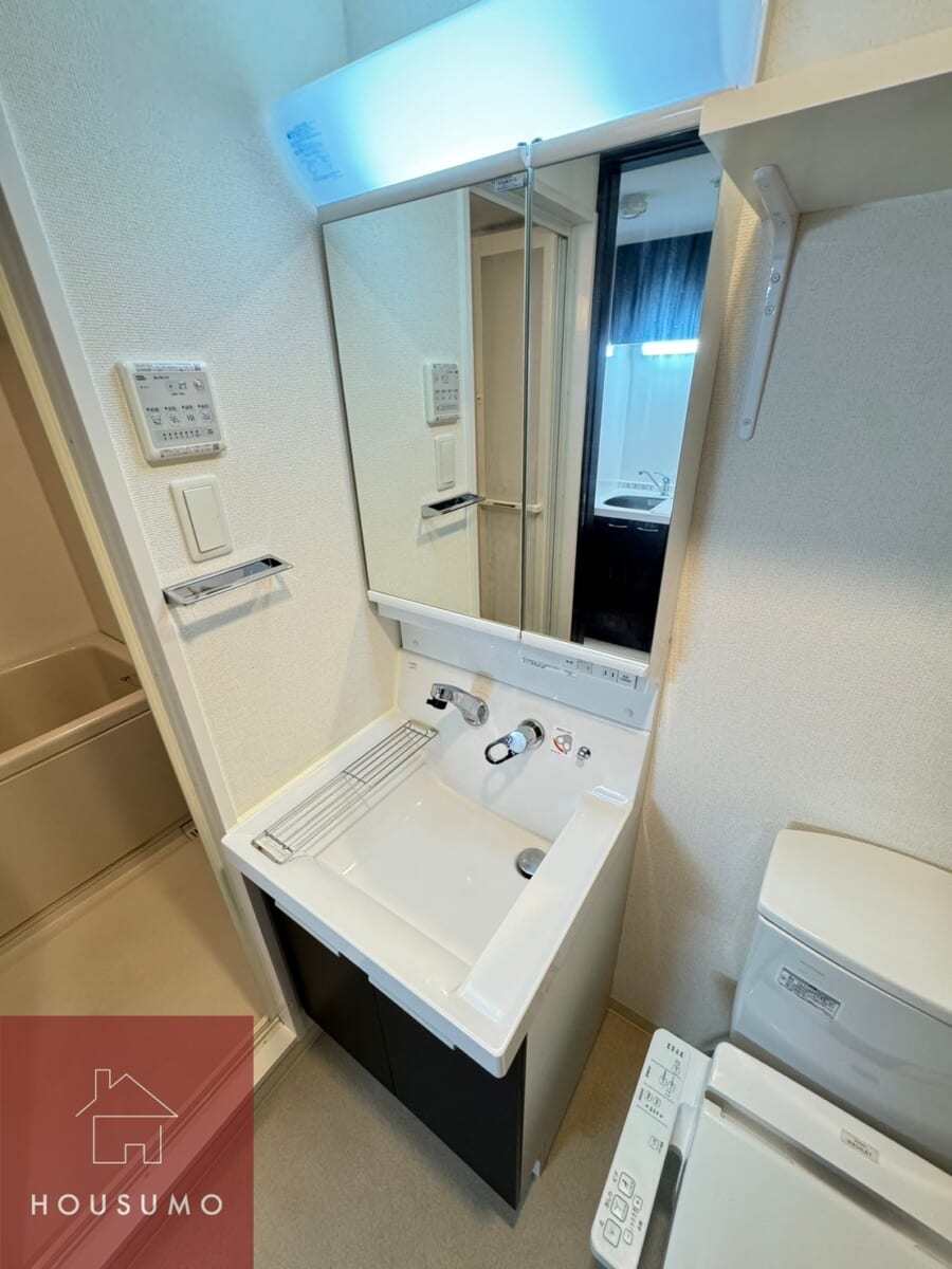 脱衣室はトイレと独立洗面台が並ぶ設計で、生活動線が非常にスムーズです。朝の準備や洗顔、歯磨き、トイレ利用まで一連の動作を無理なく行えるため、忙しい転勤者や単身者の方に特に便利です。独立洗面台は清潔感のあるデザインで、身支度の際も快適に使えます。また、独立洗面台は鏡裏収納付きで、化粧品や歯ブラシなどは”魅せない収納”で生活感を抑えながら整頓できます◎