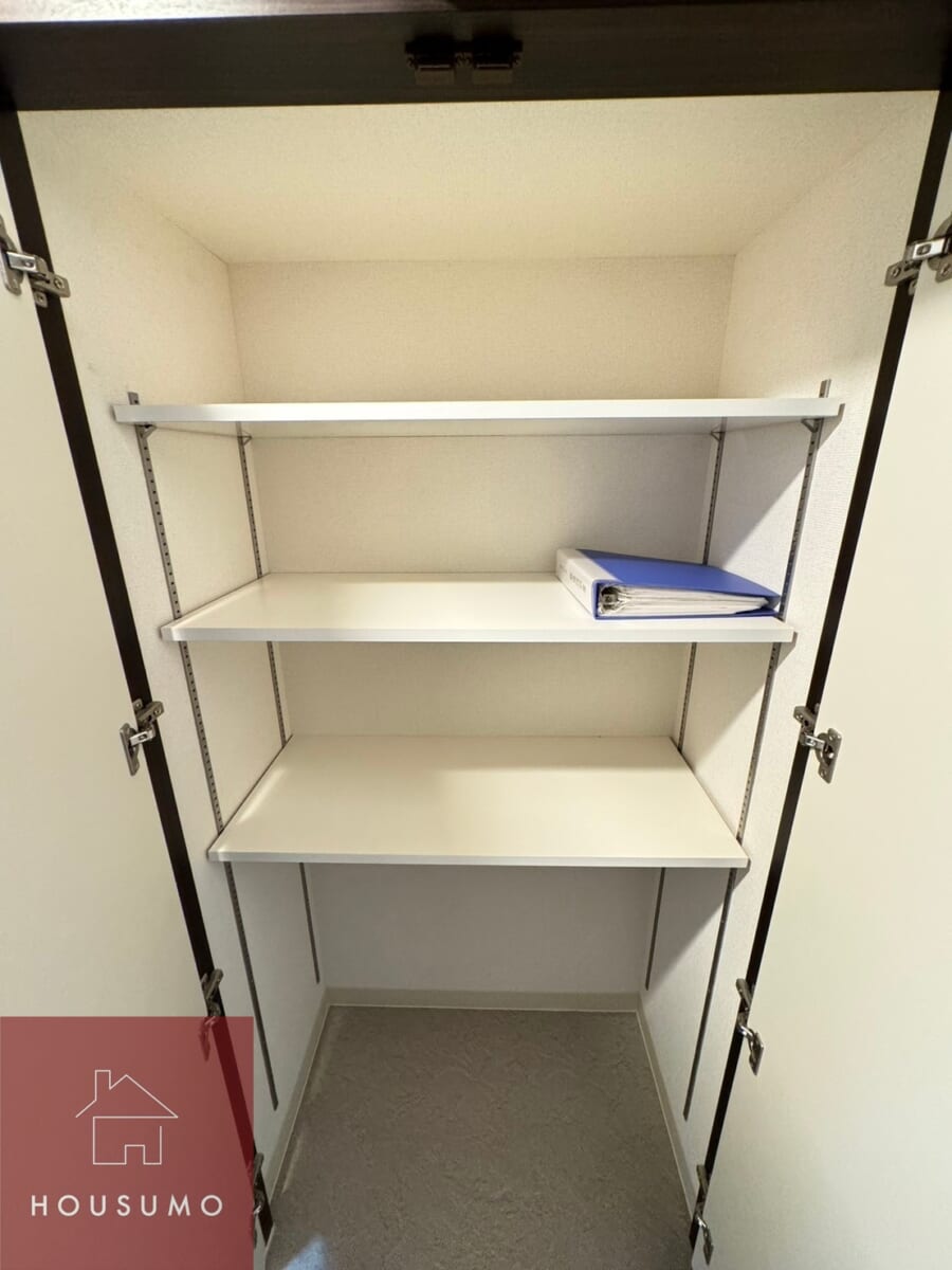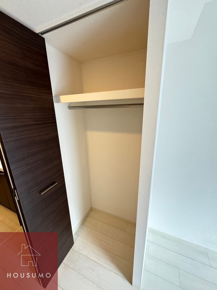 洋室にはコンパクトながら使い勝手の良いクローゼットがあり、1人暮らしの衣類や普段使いのアイテムをすっきりとまとめられるサイズで、丈の長い服も掛けられるため季節ごとの入れ替えもスムーズです。さらに玄関には、シューズクローゼットとは別にもうひとつ収納スペースがあるので、日用品のストックや雨具、掃除用品、スーツケースなど“外に近い場所に置いておきたい物”をまとめられ、居室を広く使えるのがポイントです。帰宅後の動線上に収納があることで、物の定位置が決まりやすく、毎日の片付けが自然に楽になる実用性の高い設計です◎