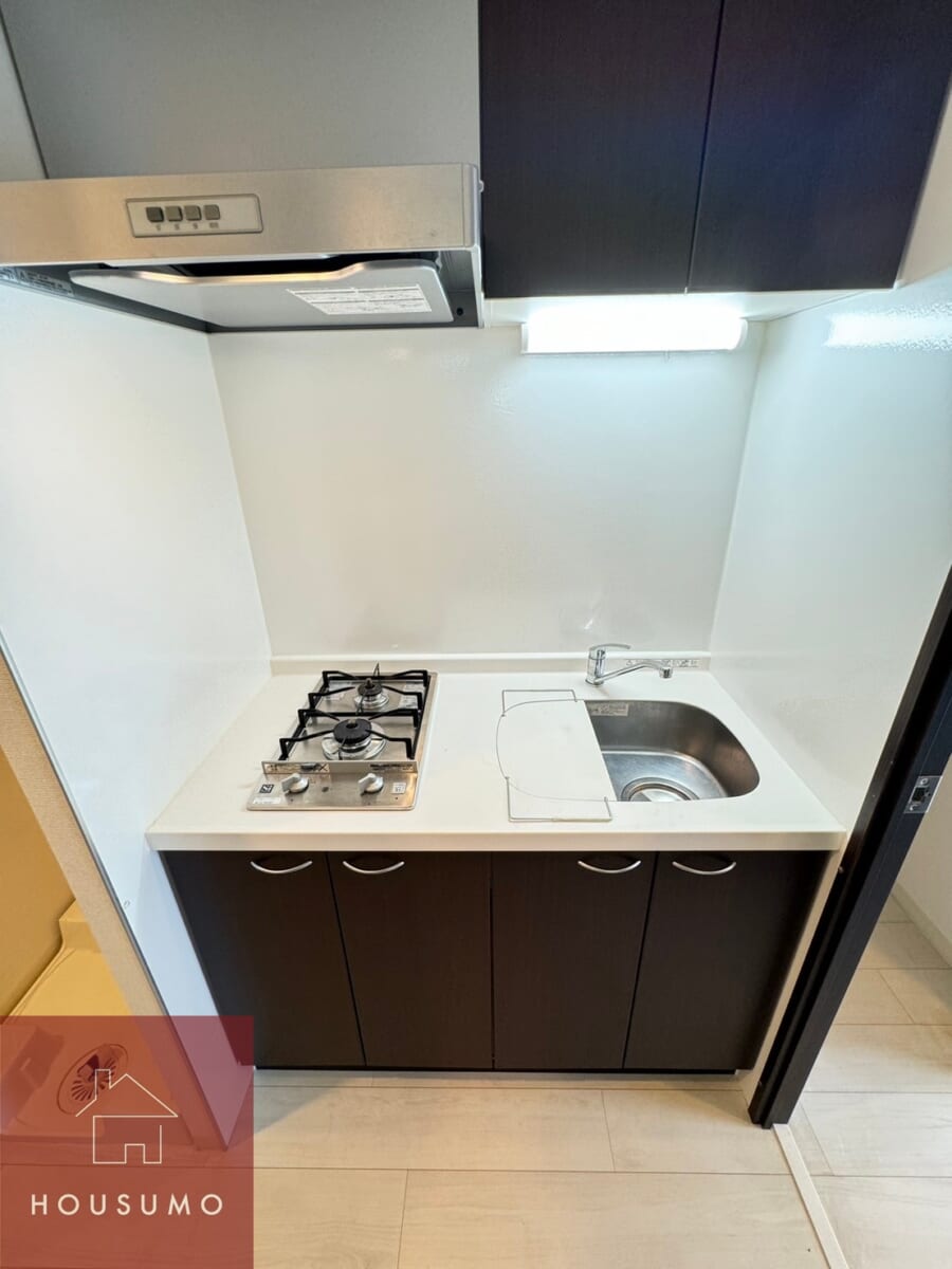 キッチンはコンパクトながら使い勝手を重視した設計で、縦型2口ガスコンロを完備。調理スペースも確保されており、同時調理が可能なので、自炊派の方にも嬉しい環境です。上下に収納スペースがあり、食器や調理器具を整理しやすく、作業効率が上がります。忙しい転勤者の方でも、シンプルな動線でスムーズに料理ができる工夫が施されています◎