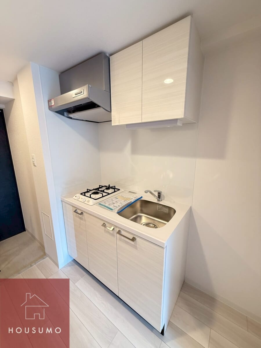 白基調の清潔感のあるキッチンはコンパクトながら使い勝手を重視した設計で、縦型2口ガスコンロを完備。調理スペースも確保されており、同時調理が可能なので、自炊派の方にも嬉しい環境です。上下に収納スペースがあり、食器や調理器具を整理しやすく、作業効率が上がります。忙しい転勤者の方でも、シンプルな動線でスムーズに料理ができる工夫が施されています◎