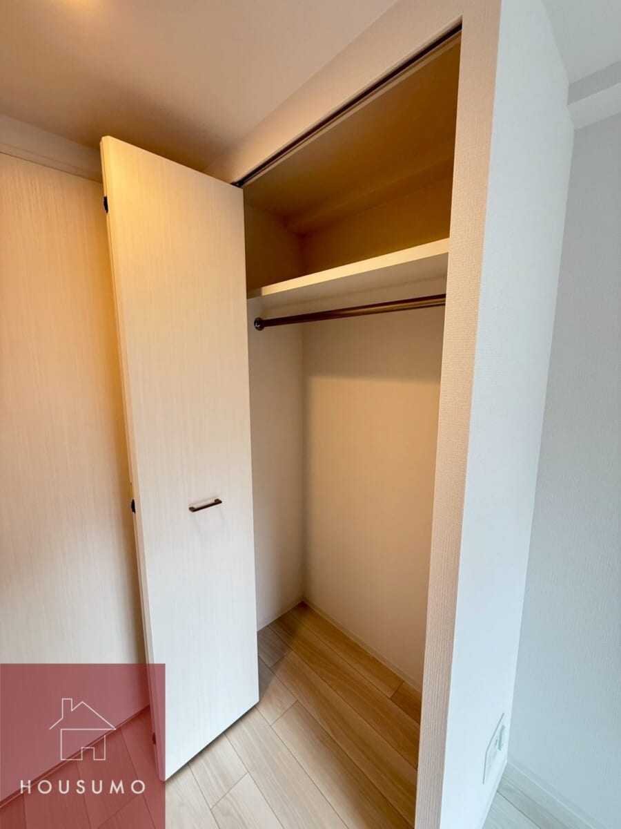 洋室に設置されたクローゼットはコンパクトですが、ハンガーラッグ付きで、丈の長いコートやシャツ類はしわなくかけることができます。入りきらないオフシーズンの衣類はボックス収納やベッド下収納などで補うのがおすすめです。限られたスペースを有効活用することで、スッキリとした暮らしが実現します◎