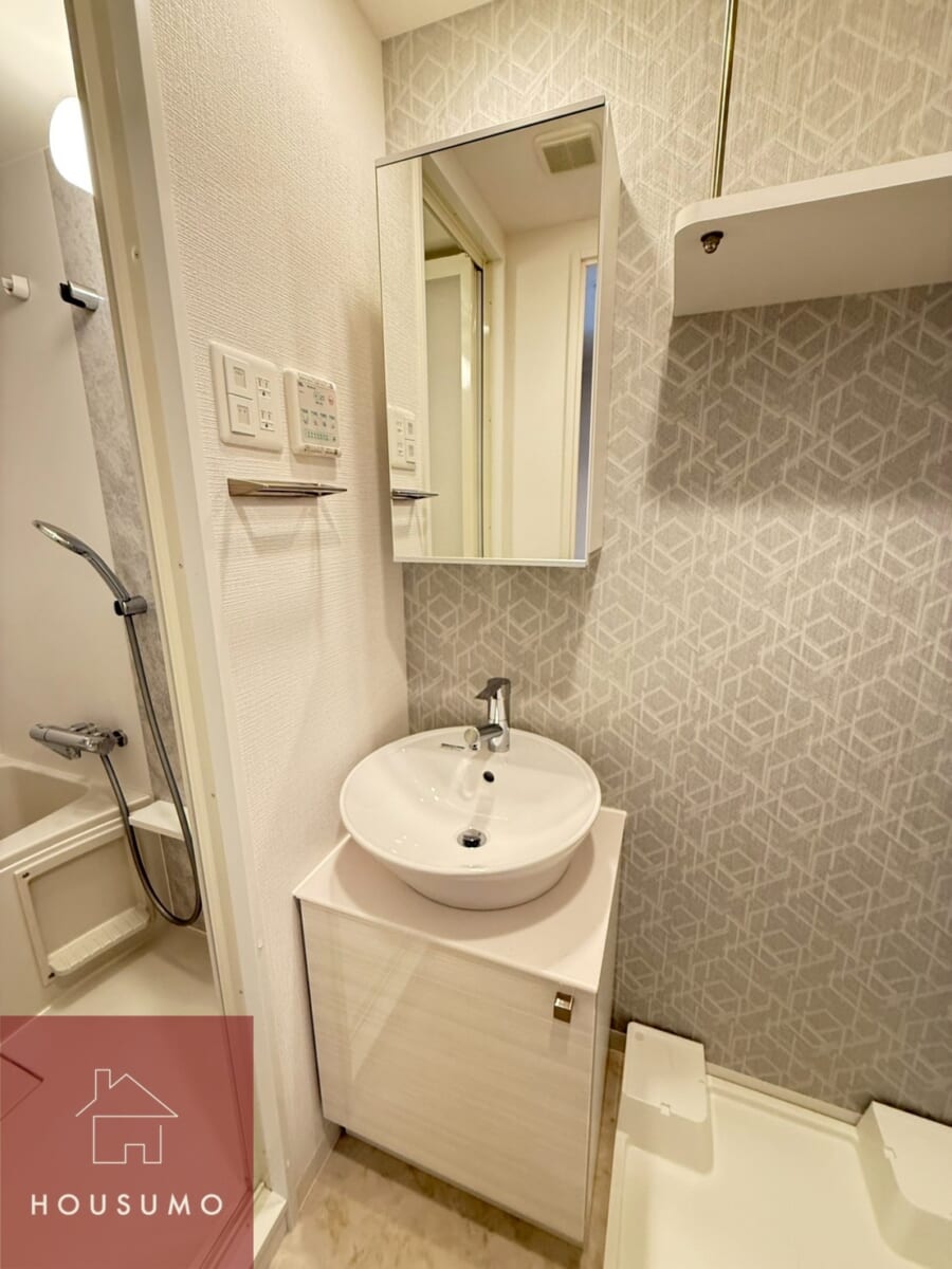 独立洗面台と洗濯機置き場が並ぶ脱衣スペースは、使い勝手の良さが魅力で、洗濯機置き場の上には収納棚が設置されており、洗剤やタオル類をきちんと整理できます。浴室には浴室乾燥機能もついているので、雨の日も乾かすことができるので快適でストレスなく日常家事がこなせます。コンパクトながらも効率的に設計された空間で、日々の家事動線をスムーズにしてくれます◎
