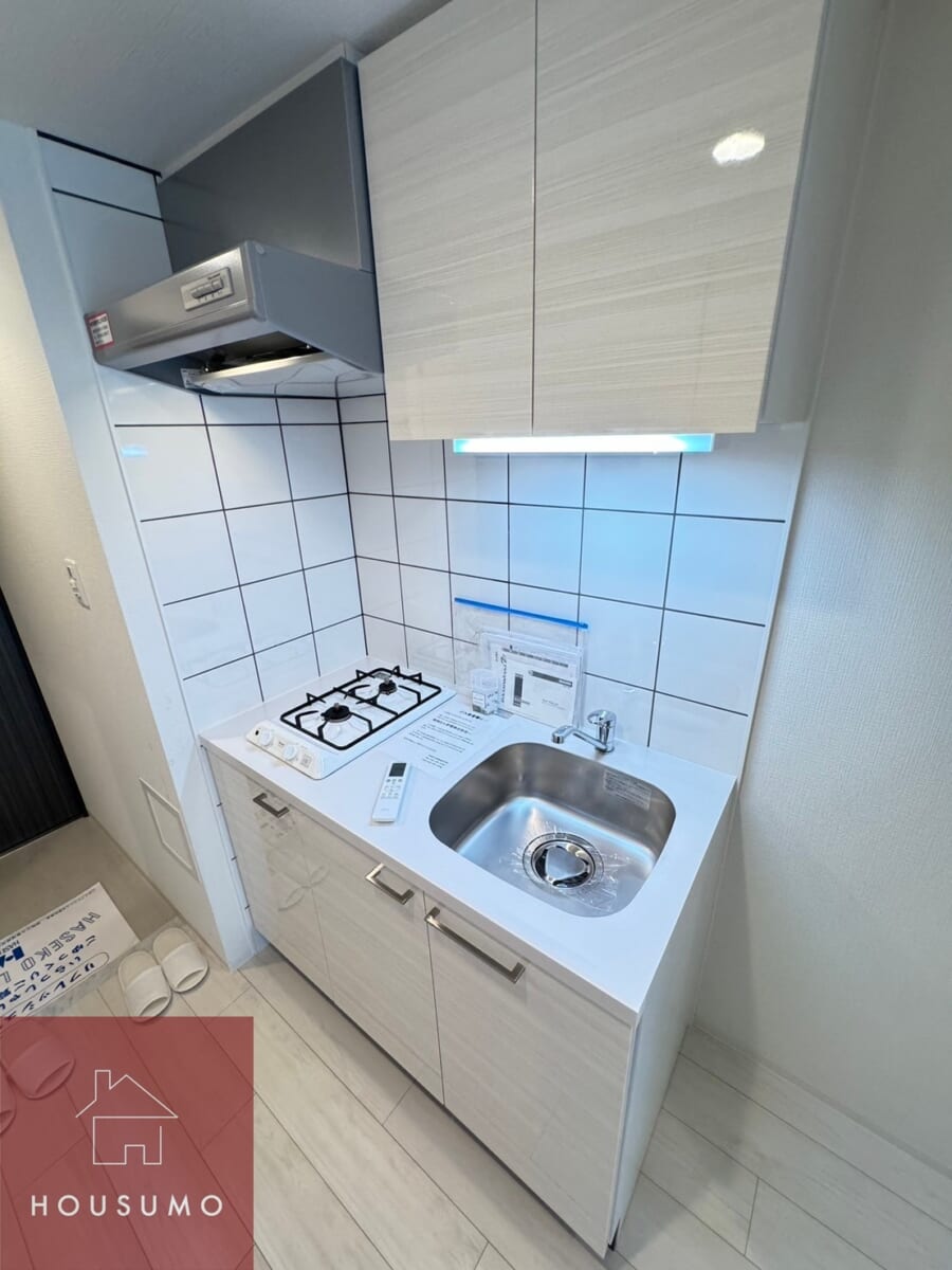 白基調で清潔感のあるキッチンはコンパクトながら使い勝手を重視した設計で、縦型2口ガスコンロを完備。調理スペースも確保されており、同時調理が可能なので、自炊派の方にも嬉しい環境です。上下に収納スペースがあり、食器や調理器具を整理しやすく、作業効率が上がります。忙しい社会人の方でも、シンプルな動線でスムーズに料理ができる工夫が施されています◎