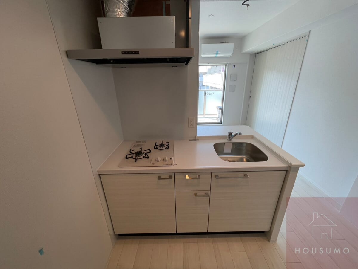 白を基調とした室内と連動したシンプル&スタイリッシュなカウンターキッチンがこのお部屋の魅力。生活感の出やすいキッチン周りも、築浅設備ならではのシャープなデザインでまとまりやすく、お料理のモチベーションを上げてくれる造りです。自炊派の方にも満足いただける2口ガスコンロタイプで、調理スペースも確保されているため、同時調理も可能で日常の料理がストレスなく進みます◎