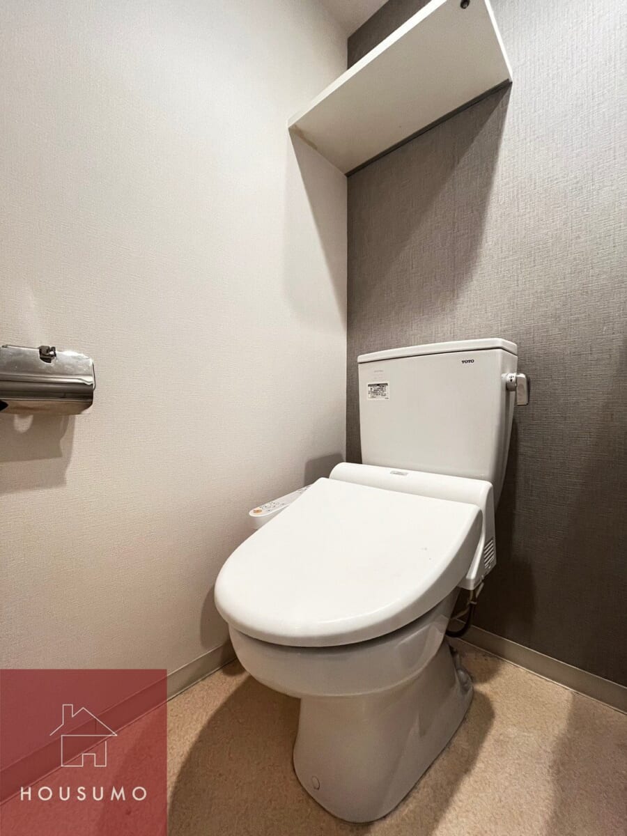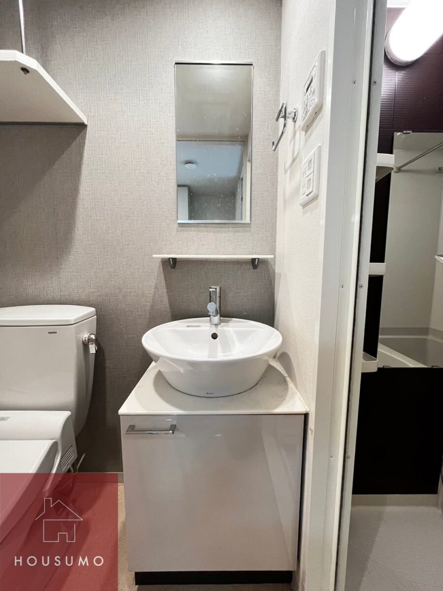 脱衣室はトイレと独立洗面台が並ぶ設計で、生活動線が非常にスムーズです。朝の準備や洗顔、歯磨き、トイレ利用まで一連の動作を無理なく行えるため、忙しい転勤者や単身者の方に特に便利です。独立洗面台は清潔感のあるデザインで、身支度の際も快適に使えます。また、洗面台周りには小物を置けるスペースが確保されており、化粧品や歯ブラシ、タオルなども整理しやすく、生活感を抑えながら整頓できます。