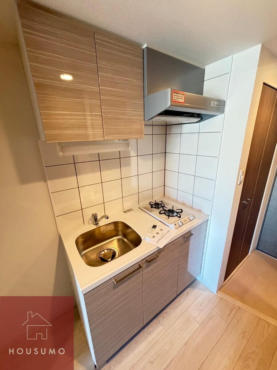 キッチンはコンパクトながら使い勝手を重視した設計で、縦型2口ガスコンロを完備。調理スペースも確保されており、同時調理が可能なので、自炊派の方にも嬉しい環境です。上下に収納スペースがあり、食器や調理器具を整理しやすく、作業効率が上がります。シンプルな動線でスムーズに料理ができる工夫が施されています。