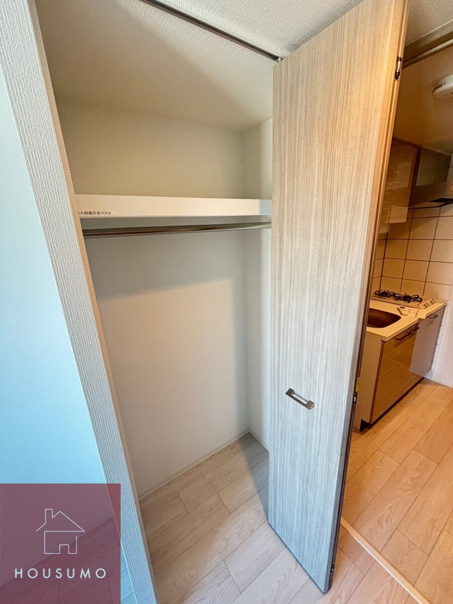 洋室に設置されたクローゼットはコンパクトですが、ハンガーラッグ付きで、丈の長いコートやシャツ類はしわなくかけることができます。入りきらないオフシーズンの衣類はボックス収納やベッド下収納などで補うのがおすすめです。限られたスペースを有効活用することで、スッキリとした暮らしが実現します。