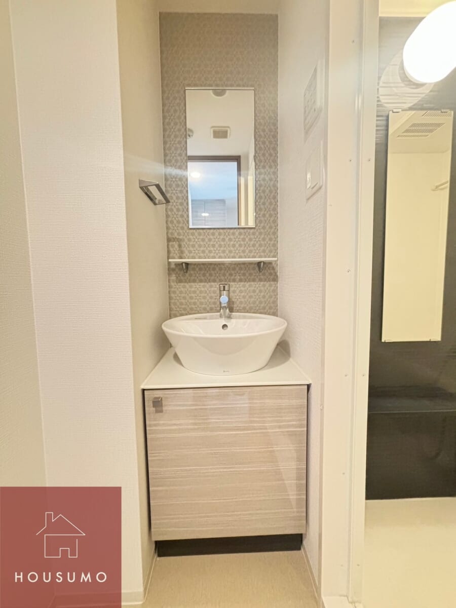 脱衣室には独立洗面台が設けられており、朝の支度や帰宅後の身だしなみを整える時間が快適に。鏡裏収納がしっかり確保されているため、スキンケア用品やヘアセット道具、日常的に使う小物類をすっきりと隠して置けます。洗面台周りに物が出っぱなしにならないので、毎日使う場所なのに自然と清潔感がキープできる点が魅力です。生活感を抑えつつ“自分のための身支度スペース”をつくりたい方にぴったりの仕様です◎