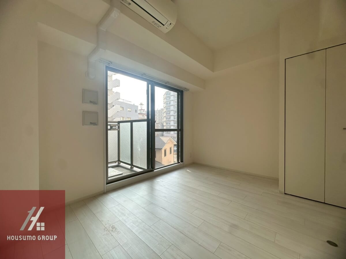 洋室は約6畳の横長タイプで、家具配置のしやすさが魅力です。縦に長い間取りと比べて視線が横に広がるため、実際の帖数以上に開放感を感じられる造り。南向きバルコニーからの採光もしっかり確保されており、日中は照明をつけなくても明るい空間が広がります。ベッド・デスク・テレビ台をバランスよく配置でき、在宅ワークやプライベート時間を快適に過ごしたい一人暮らしの方にもおすすめです。