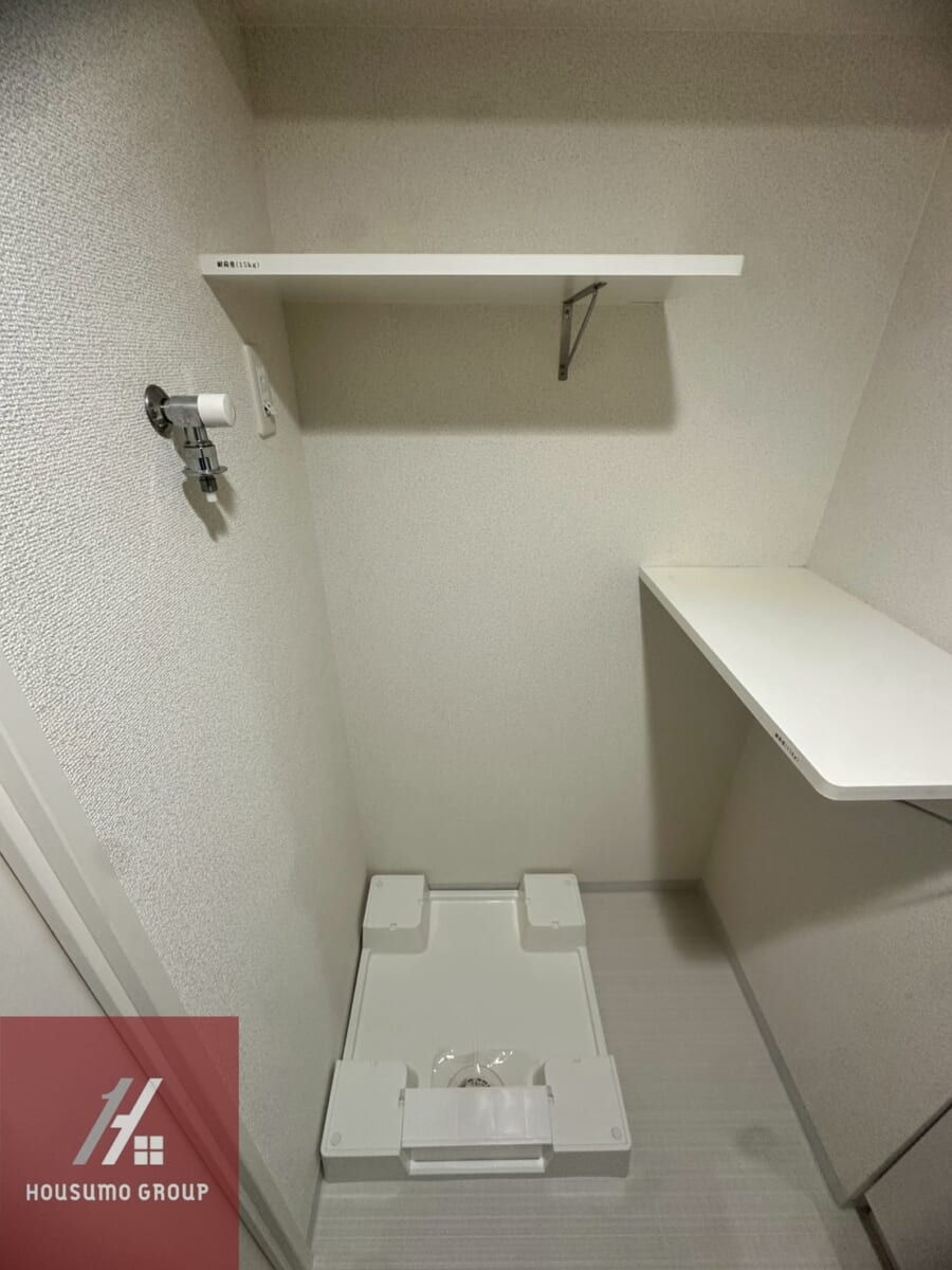 脱衣室には独立洗面台と洗濯機置き場を完備しており、白基調の空間で全体に統一感があるのが特長です。デザイン性の高さだけでなく、使い勝手にも配慮されており、朝の準備や帰宅後も快適。洗濯機置き場もゆったりと確保されており、ストレスなく日常家事がこなせます。コンパクトながらも効率的に設計された空間で、日々の家事動線をスムーズにしてくれます。