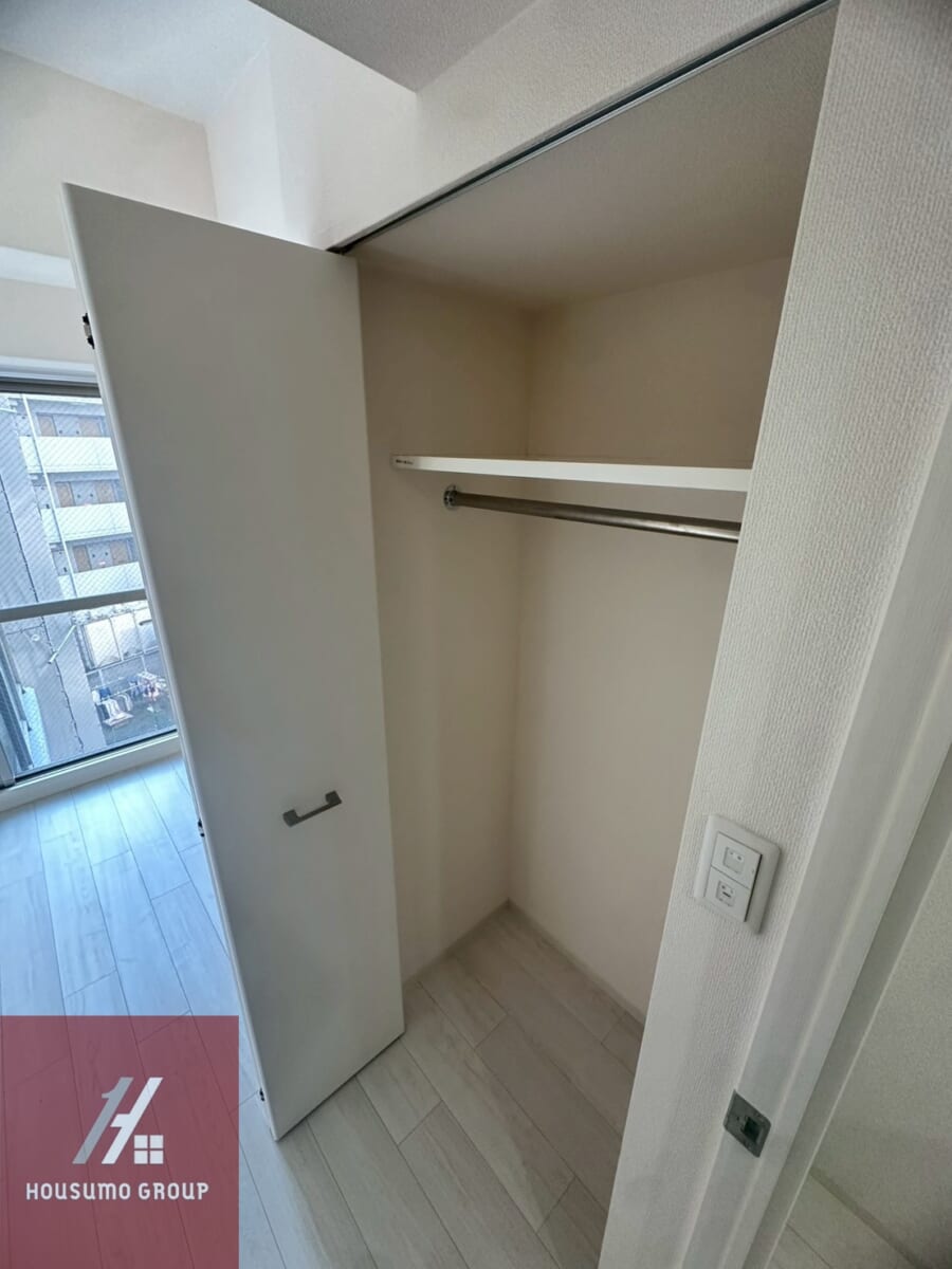 洋室に設置されたクローゼットはコンパクトですが、ハンガーラッグ付きで、丈の長いコートやシャツ類はしわなくかけることができます。入りきらないオフシーズンの衣類はボックス収納やベッド下収納などで補うのがおすすめです。限られたスペースを有効活用することで、スッキリとした暮らしが実現します。