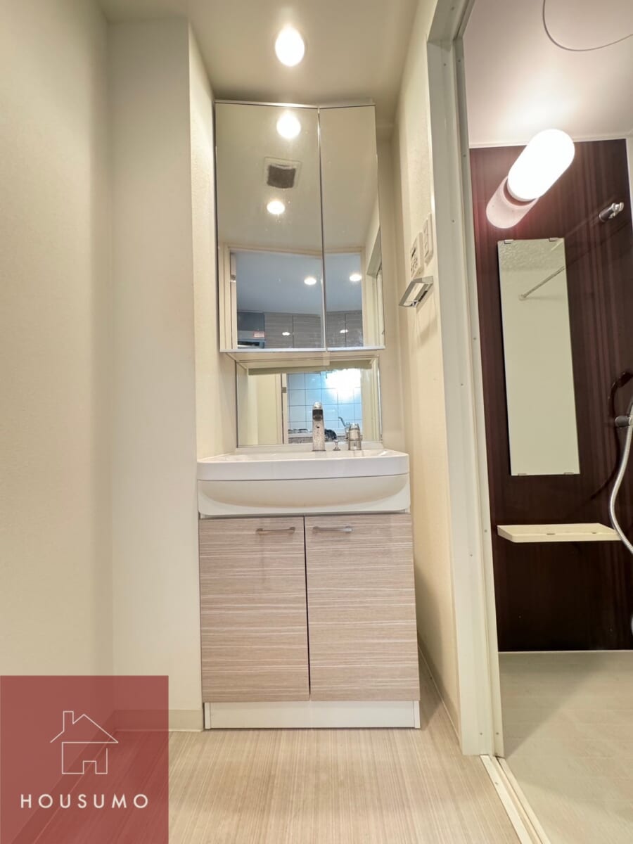 脱衣室には独立洗面台を完備。独立洗面台は、キッチンと同じカラーで設計されており、空間全体に統一感があるのが特長です。デザイン性の高さだけでなく、使い勝手にも配慮されており、朝の準備や帰宅後も快適。洗濯機置き場玄関すぐに確保されており、ストレスなく日常家事がこなせます。コンパクトながらも効率的に設計された空間で、日々の家事動線をスムーズにしてくれます。