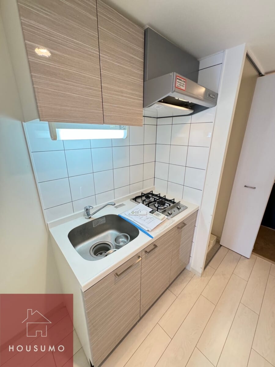 キッチンはコンパクトながら使い勝手を重視した設計で、縦型2口ガスコンロを完備。調理スペースも確保されており、同時調理が可能なので、自炊派の方にも嬉しい環境です。上下に収納スペースがあり、食器や調理器具を整理しやすく、作業効率が上がります。シンプルな動線でスムーズに料理ができる工夫が施されています。