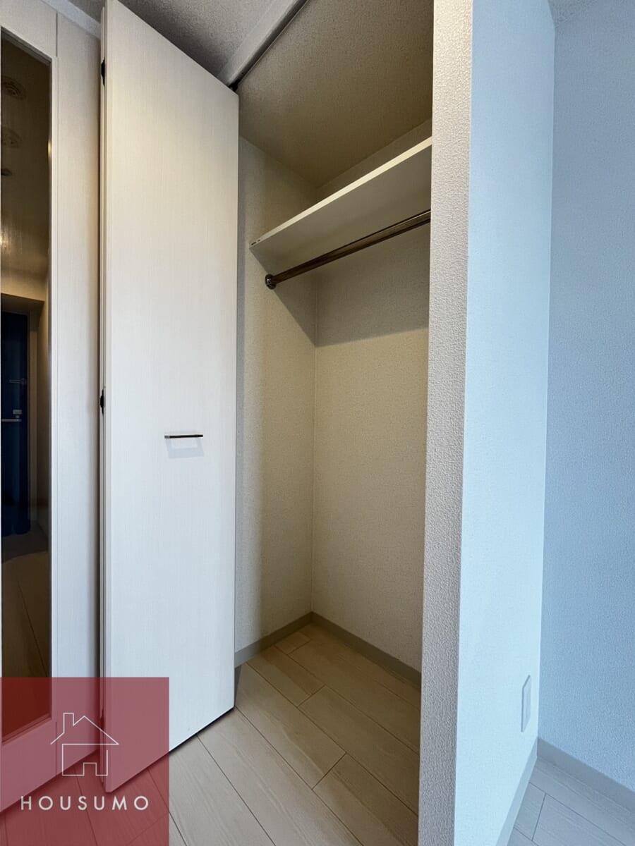洋室に設置されたクローゼットはコンパクトですが、ハンガーラッグ付きで、丈の長いコートやシャツ類はしわなくかけることができます。入りきらないオフシーズンの衣類はボックス収納やベッド下収納などで補うのがおすすめです。限られたスペースを有効活用することで、スッキリとした暮らしが実現します。