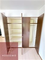 収納は大容量タイプで、ワンルームでもしっかり整理できる設計です。棚付きスペースとハンガーパイプが分かれており、衣類と小物を用途別に収納できます。可動棚のため、荷物の量やサイズに合わせて調整しやすいのも特徴。洋服だけでなく、バッグや収納ボックス、季節物の家電なども収まりやすい容量です。扉付きなので、室内から見た際も生活感が出にくいのがポイント。居室空間をすっきり使える、実用性の高い収納スペースとなっています。