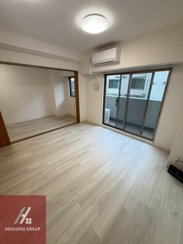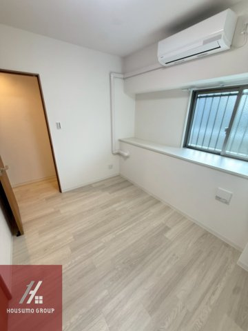 明るい木目調のフローリングが広がる洋室はリビングとの仕切りを開放することでさらに奥行きのある広々とした住空間として活用できます。バルコニーに面した大きな窓からは自然光がたっぷりと差し込み日中も照明なしで過ごせるほど明るく開放感に満ちています。エアコンが標準装備されているため入居したその日から一年中快適な温度で自分らしい時間を過ごせるのが嬉しいポイントです。お部屋の角にはクローゼットが配置されており衣類や日用品をすっきりと整理できるため居住スペースを有効に保ちながら生活感を抑えた空間作りを楽しめます。
