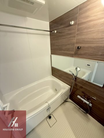 浴室は木目調のアクセントパネルが落ち着いた空間を演出し一日の疲れを癒やすリラックスタイムを支えてくれます。ゆったりと浸かれるバスタブには追い焚き機能が完備されておりいつでも温かいお風呂を楽しめるのが大きな魅力です。雨の日や夜間の洗濯にも便利な浴室乾燥機が備わっているため天候に左右されず家事をスムーズに進めることができます。横長に配置されたワイドミラーが空間に奥行きをもたらし機能性とデザイン性を両立させた清潔感あふれる空間に仕上がっています。