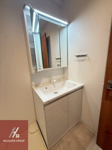 脱衣所には身支度に便利な三面鏡付きの独立洗面化粧台が完備されており鏡の裏には小物を整理できる収納スペースも確保されています。洗面ボウルは一体型で継ぎ目がないため汚れが溜まりにくく日々のお手入れを簡単に行えるのが魅力です。明るい照明が鏡回りを照らしてくれるので朝のメイクやヘアセットもスムーズに進めることができ快適な毎日をサポートします。下部には洗剤やストック品をたっぷり保管できる扉付きの収納があるほか横には室内洗濯機置き場も備わっており家事動線に優れた機能的な空間です。