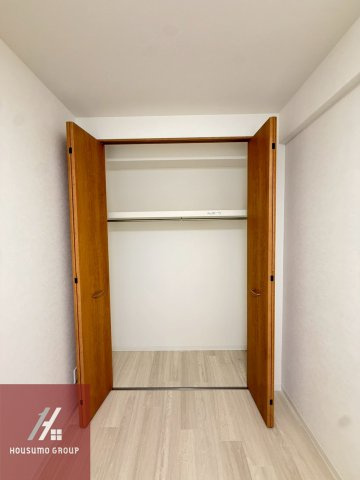 洋室に備えられたクローゼットはハンガーパイプと枕棚が設置されており衣類から小物まで効率よく整理できる実用的な設計です。折れ戸タイプを採用しているため開口部が広く中身を一目で確認できるほか大きな荷物の出し入れもスムーズに行えます。内部の奥行きもしっかりと確保されているため足元に衣装ケースなどを置くことで収納力をさらに高めることが可能です。木目調の扉が白い壁のアクセントとなり居住スペースをすっきりと保ちながらお部屋全体の落ち着いた雰囲気を引き立てています。